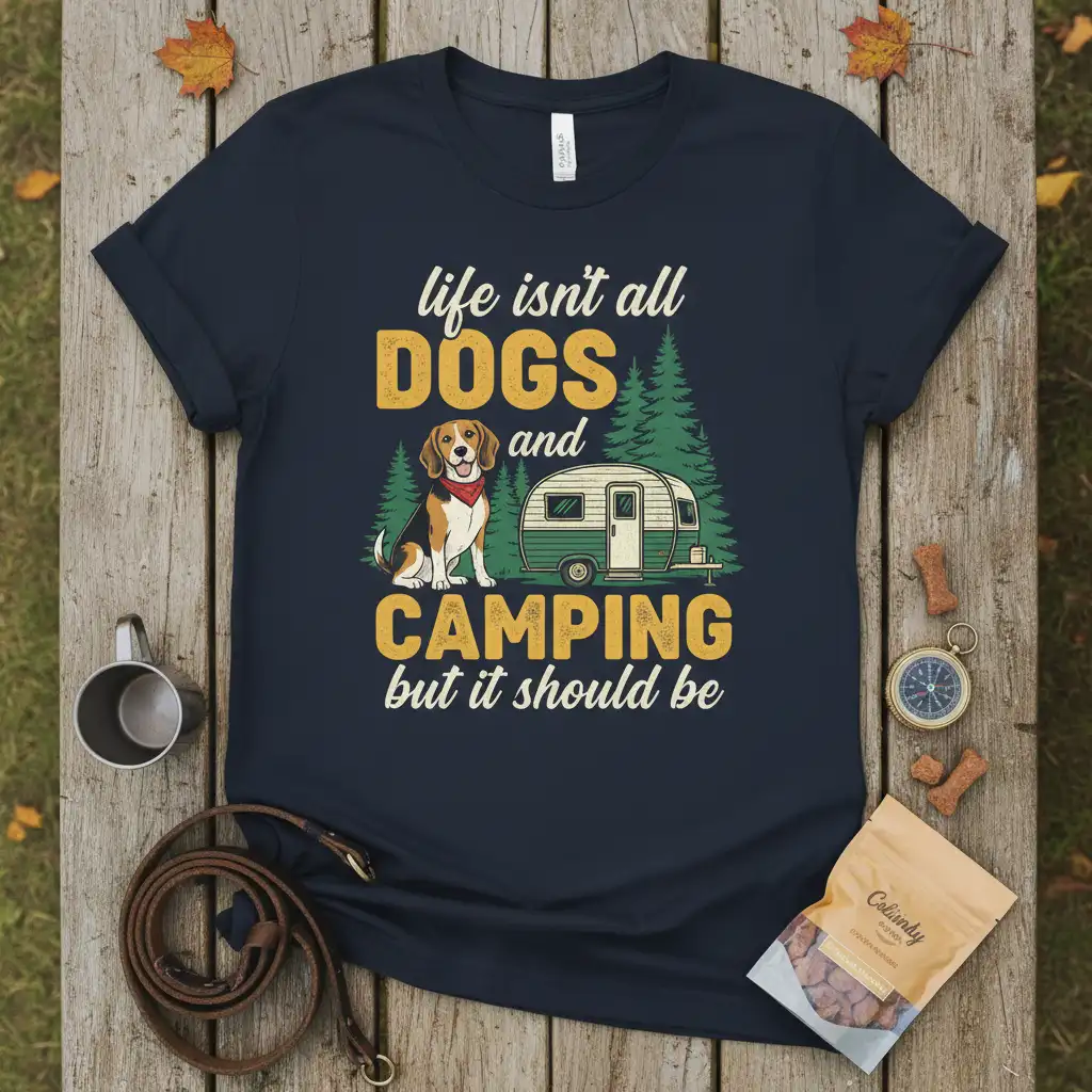 life isn’t all DOGS and CAMPING but it should be, this t-shirt is designed for those who live by this mantra. It’s more than just apparel; it’s a declaration of priorities for dog enthusiasts and avid campers alike. The graphic artfully blends the joy of canine companionship with the freedom of the open road and the tranquility of nature. This unique design speaks volumes to anyone whose ideal vacation involves wagging tails and starry nights under the open sky.