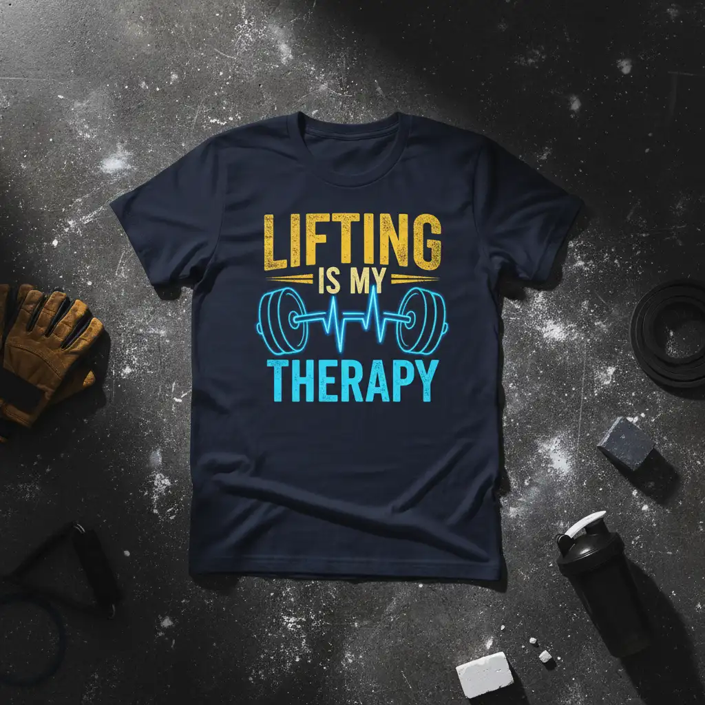 For many, the gym is a sanctuary, a place where stress melts away and personal goals are achieved. This “Lifting Is My Therapy” t-shirt perfectly encapsulates that sentiment. The design features bold, distressed yellow lettering for “LIFTING IS MY” and a striking blue combination of a barbell and a heartbeat EKG line for “THERAPY.” This visual metaphor powerfully communicates how weightlifting is not just a hobby, but a crucial element of mental and emotional health.