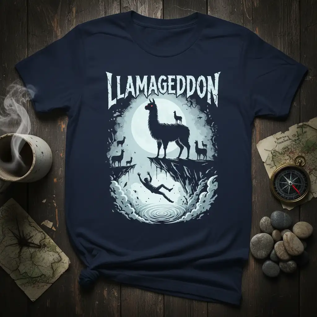 Dive headfirst into the llama-themed chaos with the Llamageddon T-Shirt. This design captures a moment of pure, unadulterated alpaca-adjacent mayhem, complete with a dramatic cliffside, a falling figure, and an imposing llama overseeing it all. It’s a visual narrative that speaks to the unexpected twists life can throw at you, all with a humorous spin.