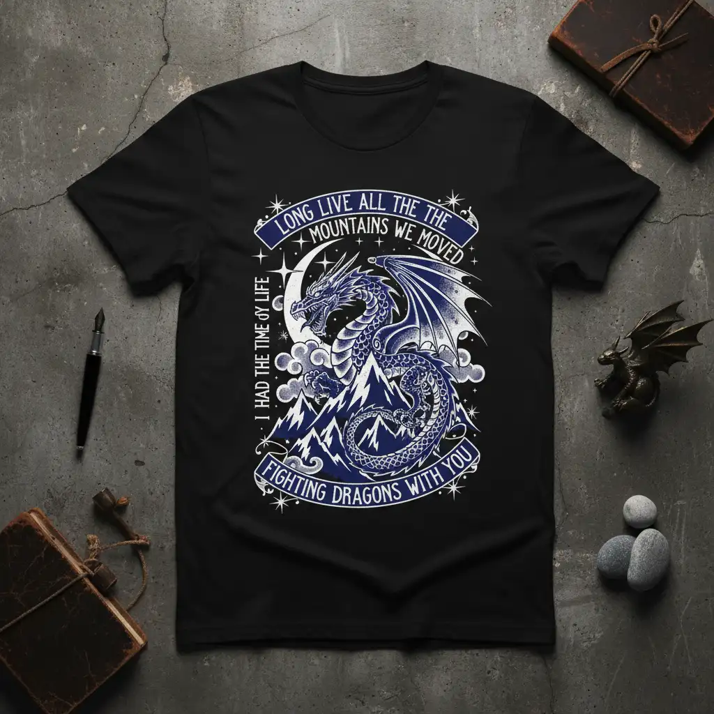 LONG LIVE ALL THE THE MOUNTAINS WE MOVED I HAD THE TIME OF LIFE FIGHTING DRAGONS WITH YOU t-shirt embodies the spirit of adventure and the thrill of overcoming challenges. This design speaks to the soul of anyone who has faced their own metaphorical dragons, whether they be personal struggles, ambitious goals, or grand journeys. It’s more than just apparel; it’s a wearable testament to resilience, courage, and the unforgettable experiences that shape us. The intricate artwork and powerful quote combine to create a statement piece that resonates deeply.