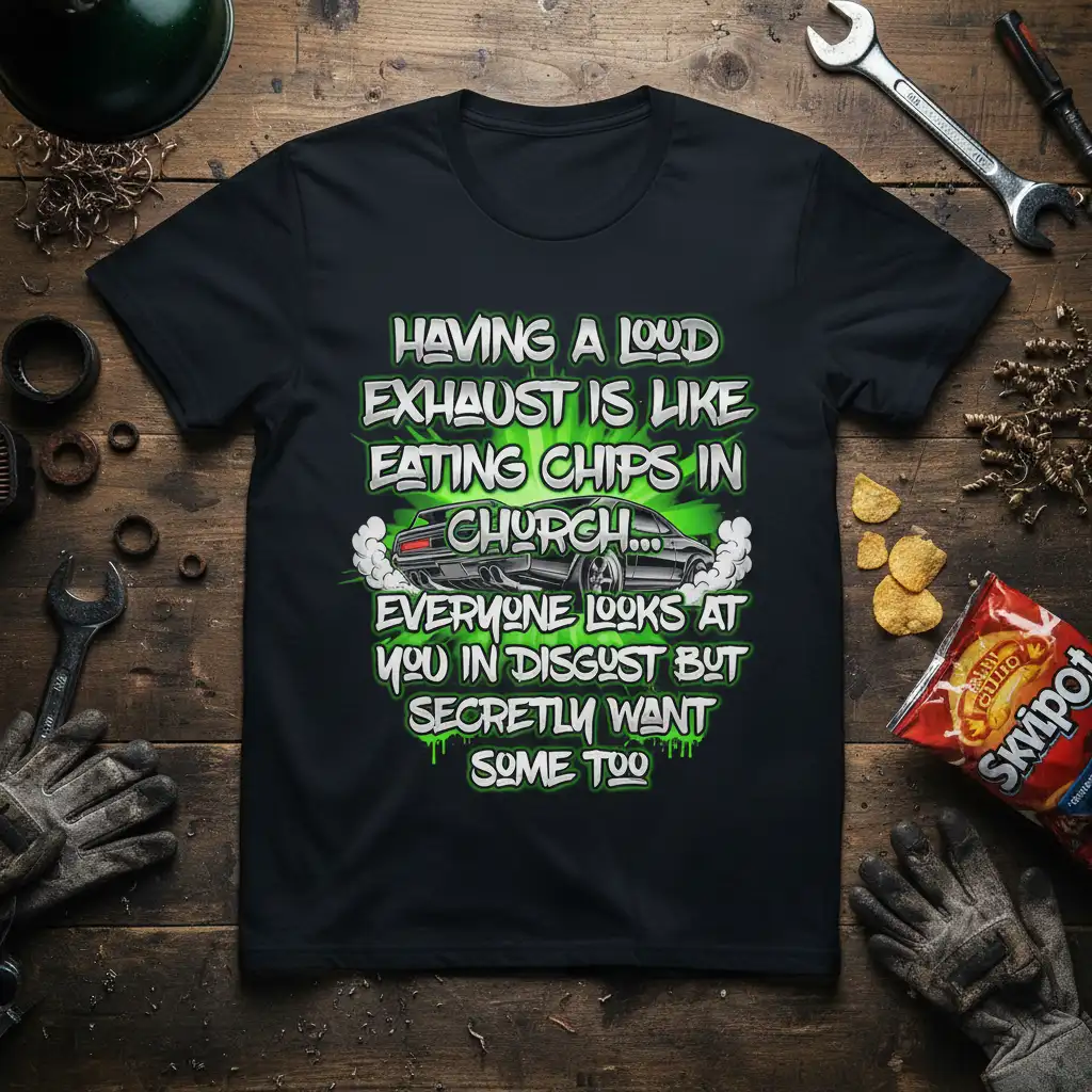 This “Loud Exhaust Is Like Chips In Church” t-shirt is more than just clothing; it’s a statement piece for anyone who loves cars and appreciates a good laugh. The design perfectly blends automotive passion with relatable humor, making it a standout addition to any wardrobe. It’s an ideal gift for friends, family, or even yourself if you’re a dedicated car enthusiast who understands the joy of a roaring engine. Grab yours today and let your passion be heard (and seen!).