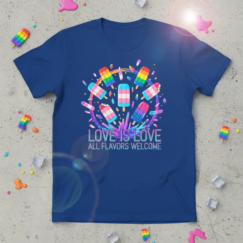 The “LOVE IS LOVE ALL FLAVORS WELCOME” graphic is not just a design; it’s a movement. It speaks volumes about the importance of acceptance and the understanding that love knows no boundaries. The rainbow and transgender flag motifs integrated into the popsicle design serve as powerful symbols of solidarity and pride, making this t-shirt a beacon of inclusivity. Its bright, cheerful aesthetic is sure to bring smiles and foster connections.