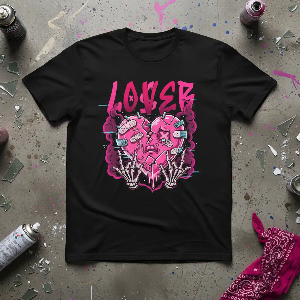 The “Lover” t-shirt showcases a powerful visual narrative that speaks to themes of love, heartbreak, and resilience. The prominent “Lover” text, rendered in a bold, pink, graffiti-inspired font, immediately sets a tone of intense emotion. This is complemented by the central graphic: a cracked pink heart, meticulously patched with band-aids and bandages, suggesting a journey through emotional wounds. The inclusion of skeleton hands reaching out from the sides adds a layer of dark romanticism and edgy flair, common in alternative and emo fashion scenes.