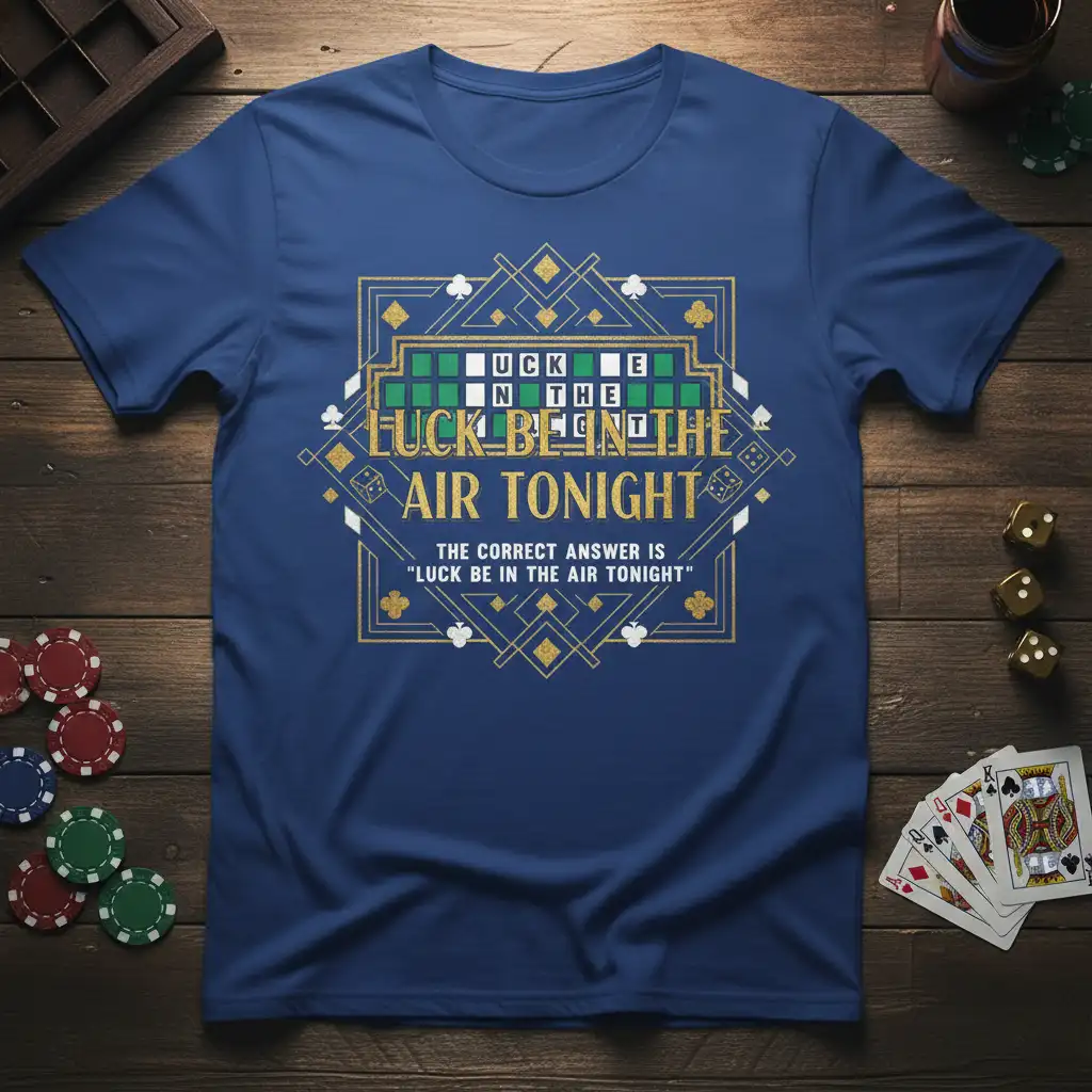 This t-shirt proudly displays the popular phrase “Luck Be In The Air Tonight,” presented in a format that evokes the excitement of a television game show. The design features a grid of letters, mimicking a word-solving challenge, with the full quote prominently displayed below. Intricate golden geometric patterns and subtle nods to playing cards surround the central text, adding a touch of sophistication and flair. It’s a perfect wearable tribute to beloved word games and the thrill of guessing the right answer.