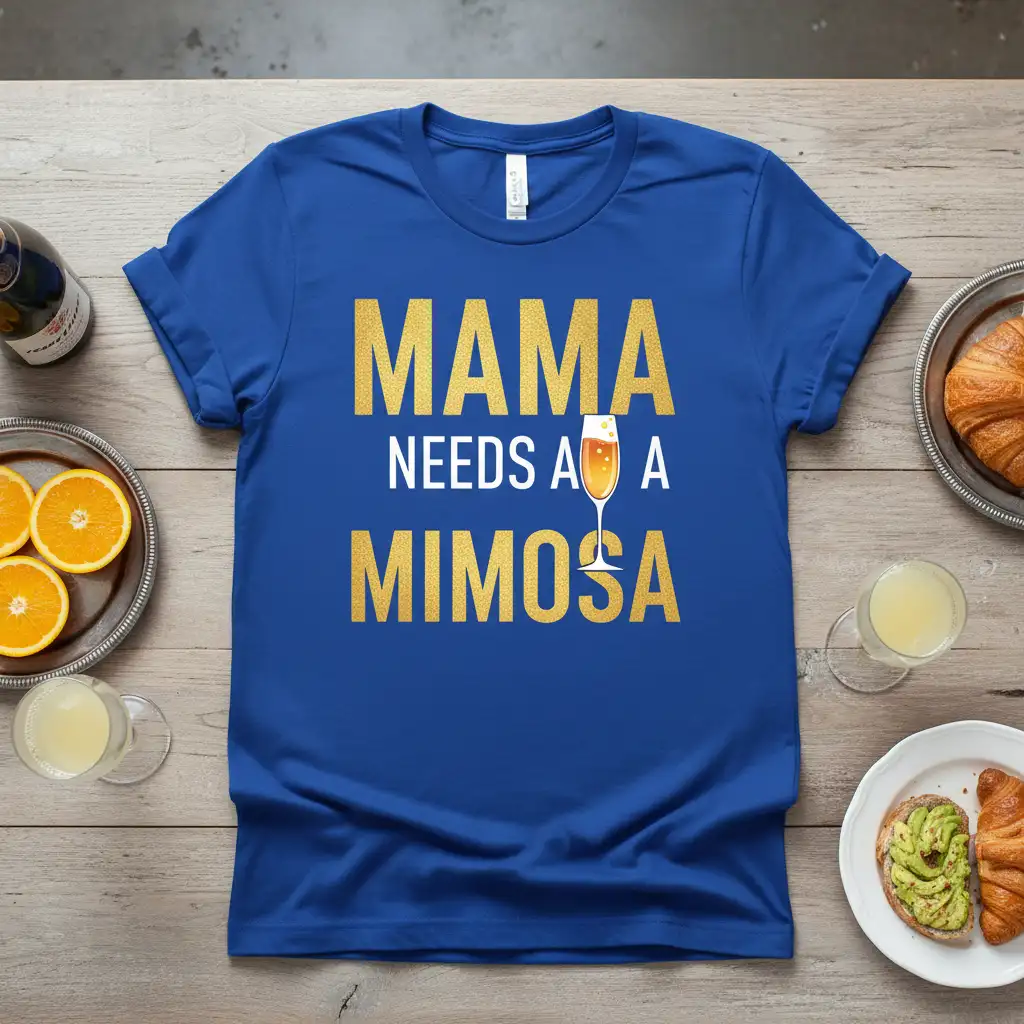 Pick from Black, Navy, Royal, Dark Heather, Red, and White to match your mood and wardrobe staples. Each colorway keeps the Mama Needs A Mimosa design clear and photo-ready for everyday wear.