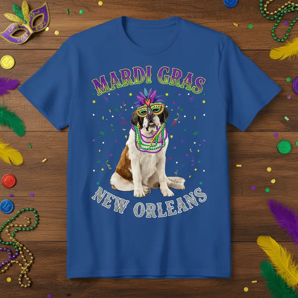 This eye-catching t-shirt showcases a charming St. Bernard dog dressed up for Mardi Gras. The dog is sporting colorful beads and a festive masquerade mask, complete with feathers, truly embodying the celebratory mood. Surrounding the dog are playful confetti and star graphics, adding to the dynamic and exciting visual appeal of the design. It’s a perfect blend of canine charm and carnival spirit, making it a unique piece for any dog lover or New Orleans enthusiast.