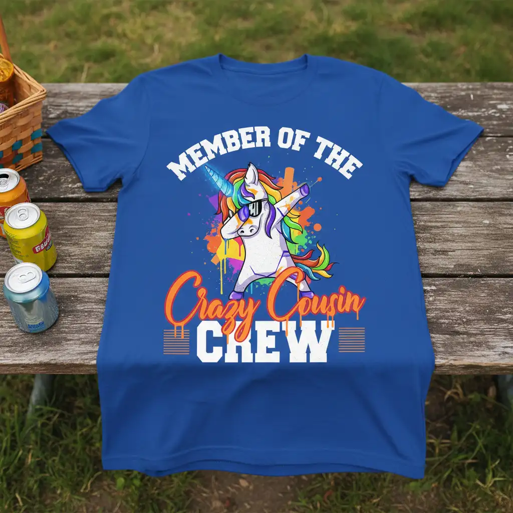 This Member of the Crazy Cousin Crew design is perfect for anyone who considers their cousins their closest friends. It features bold white lettering that reads “MEMBER OF THE” above a vibrant, dabbing unicorn. The unicorn itself is a spectacle of color, with a rainbow mane and tail, cool sunglasses, and a confident stance, symbolizing the fun-loving and slightly wild nature of the crew.