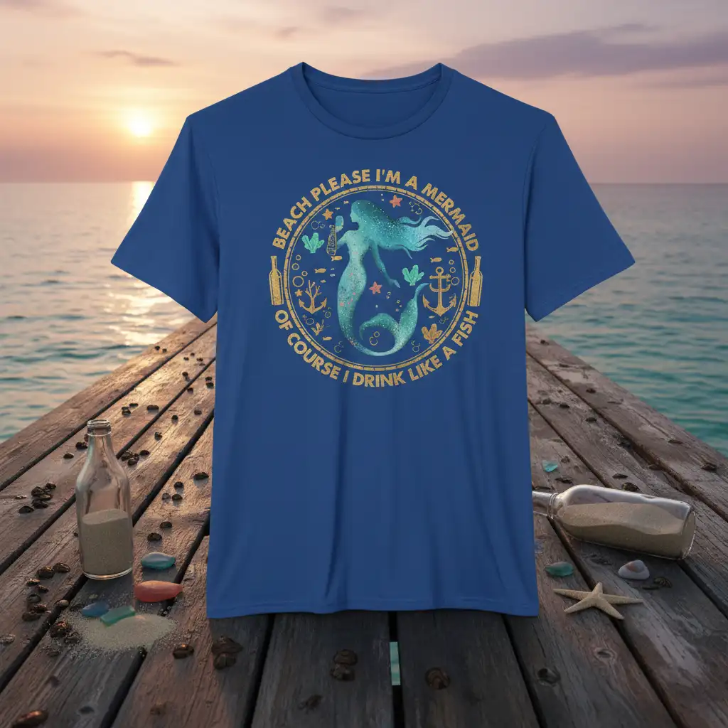 Beach Please I’m A Mermaid Of Course I Drink Like A Fish, this phrase perfectly captures the spirit of those who love the ocean, good company, and perhaps a refreshing beverage. This t-shirt is more than just apparel; it’s a statement piece for anyone who feels a connection to the sea and enjoys a bit of playful humor. Imagine yourself basking in the sun, feeling the ocean breeze, and wearing a design that truly represents your carefree attitude. It’s ideal for beach parties, summer vacations, or just a casual day out where you want to express your unique personality. This design is sure to turn heads and spark conversations, making it a fantastic addition to any wardrobe.