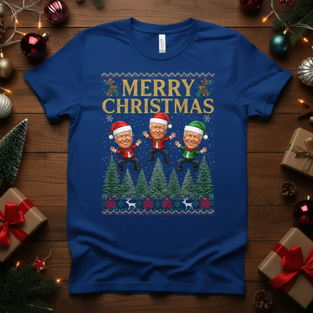 This eye-catching Merry Christmas T-Shirt features a playful and topical design that injects a dose of political humor into your holiday celebrations. The text “MERRY CHRISTMAS” is emblazoned across the top in a dazzling gold glitter font, immediately setting a festive tone. Below the greeting, three caricatured figures, humorously depicted in Santa hats and festive outfits, are captured in mid-jump, adding a dynamic and comical element to the shirt.