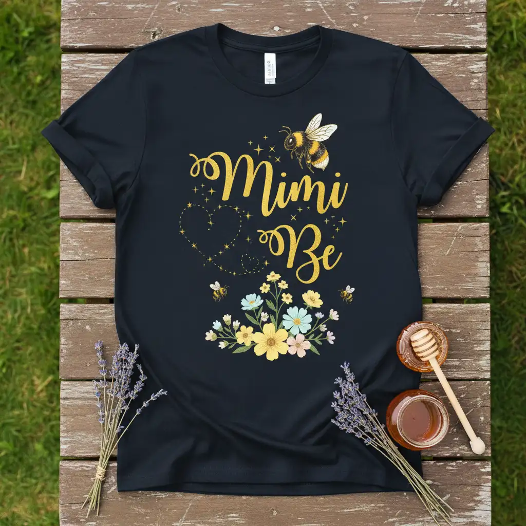 This t-shirt is more than just apparel; it’s a declaration of love and a celebration of grandmotherhood. The phrase “Mimi Be” is rendered in a flowing, golden font that sparkles with a subtle shimmer, making the design truly eye-catching. A cheerful bumblebee hovers near the text, symbolizing the busy, buzzing energy and sweetness associated with grandmothers. The surrounding floral arrangement adds a touch of natural beauty and charm.
