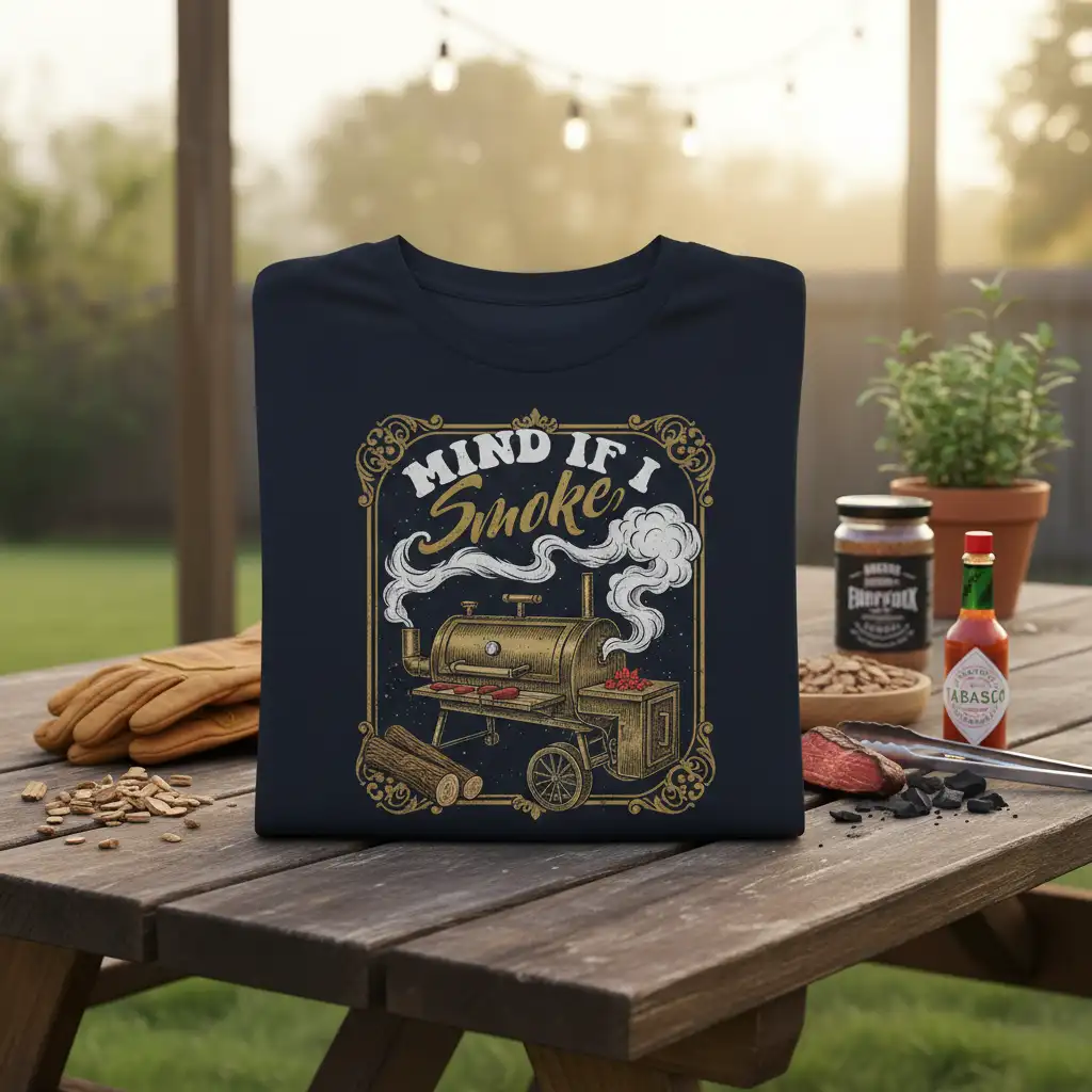 The “Mind If I Smoke” slogan is perfectly integrated, capturing the playful yet serious dedication of a true grill master. It’s the kind of shirt that sparks conversation and camaraderie among fellow barbecue lovers, whether you’re at a backyard cookout or a competitive BBQ event.