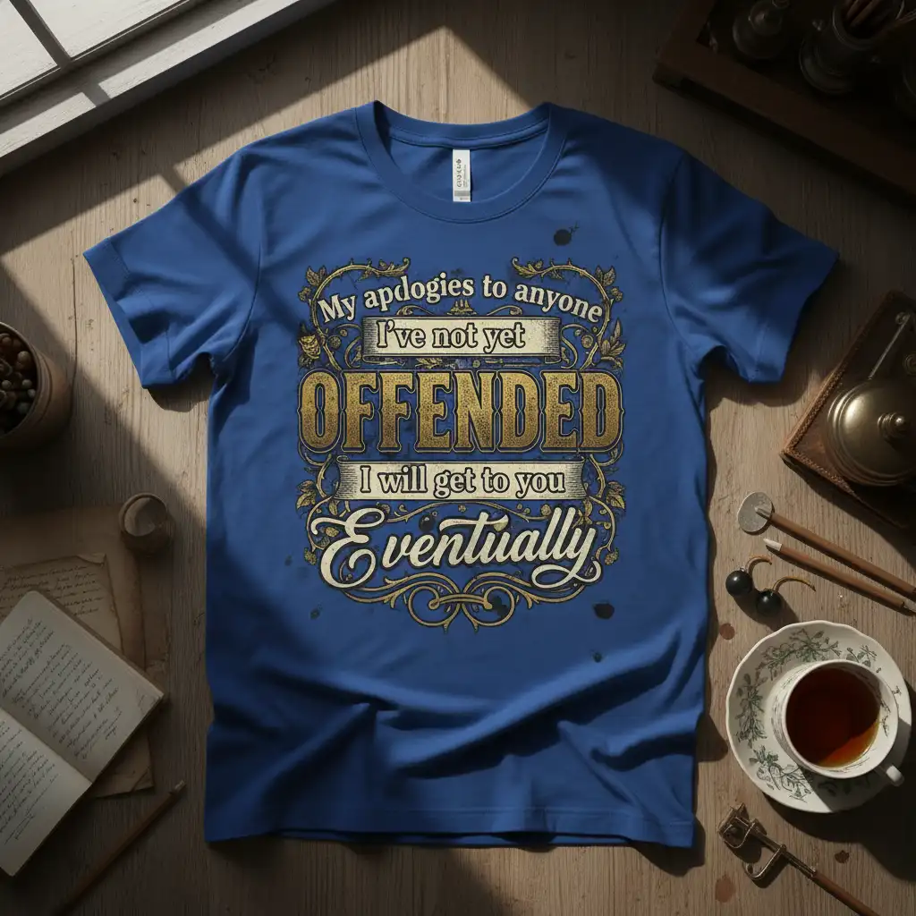 Make a bold statement and express your distinct personality with this humor-infused t-shirt. The “My apologies to anyone I’ve not yet OFFENDED I will get to you Eventually” quote is more than just text; it’s an attitude. It’s perfect for those who enjoy a bit of playful defiance and aren’t afraid to show off their witty side. Don’t miss out on the chance to own this conversation-starting piece that combines comfort, style, and a whole lot of humor. Grab yours today and let the world know you’re ready to offend, eventually!