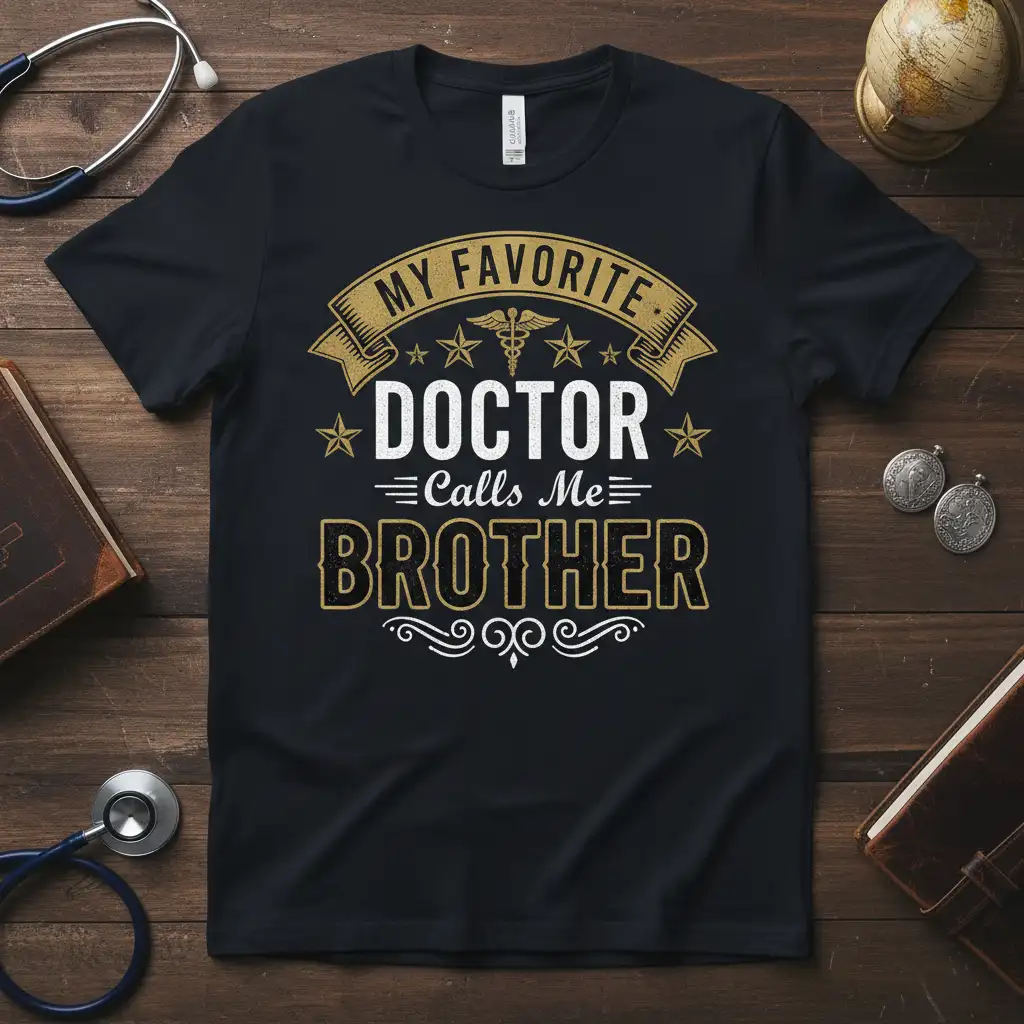 To complement the design and your personal style, the shirt comes in several classic colors. Select from versatile Black, deep Navy, vibrant Red, clean White, subtle Dark Heather, or striking Royal. Each color option offers a distinct look while maintaining the impact of the “My Favorite Doctor Calls Me Brother” graphic.
