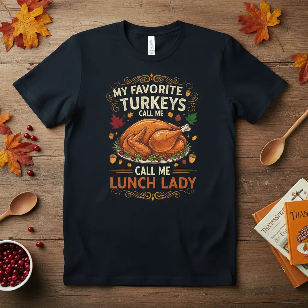 MY FAVORITE TURKEYS CALL ME CALL ME LUNCH LADY – My Favorite Turkeys Call Me Lunch Lady shirt is the perfect way to express your holiday spirit and your role in serving up delicious meals. This unique design captures the fun and festive essence of Thanksgiving, making it an ideal choice for anyone who works in food service or simply loves to cook and celebrate. It’s more than just a t-shirt; it’s a conversation starter and a wearable piece of holiday cheer. The detailed graphic and witty slogan are sure to bring smiles to faces. Get ready to make this Thanksgiving even more memorable with this delightful apparel.