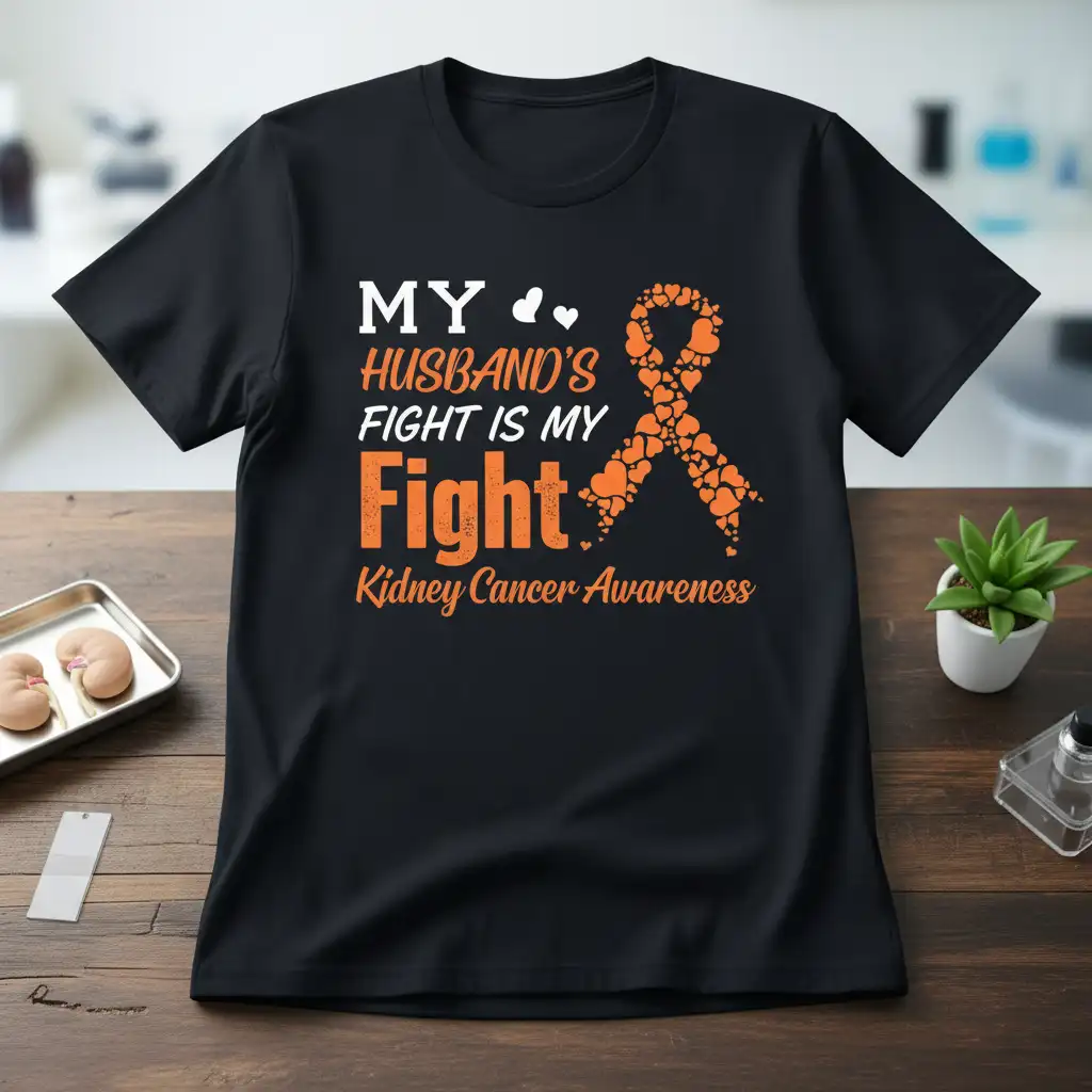The orange ribbon, a recognized symbol for kidney cancer awareness, is beautifully rendered here as a mosaic of small hearts. This symbolizes the collective love, hope, and strength that surrounds the individual fighting the disease. Each heart represents a prayer, a wish, or a moment of shared courage. The phrase “My Husband’s Fight Is My Fight” emphasizes the deep connection and shared journey between spouses.