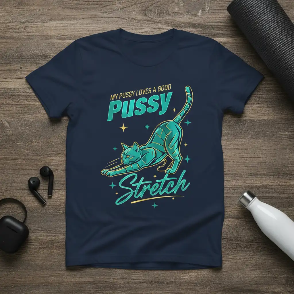 This eye-catching t-shirt proudly displays the full quote “MY PUSSY LOVES A GOOD PUSSY Stretch” alongside a vibrant graphic of a cat in a deep, satisfying stretch. The design expertly blends playful typography with a stylish illustration, creating a visual that is both humorous and aesthetically pleasing. It’s the perfect way to express your love for your feline companions and your appreciation for a good stretch, whether you’re hitting the yoga mat or just lounging at home.