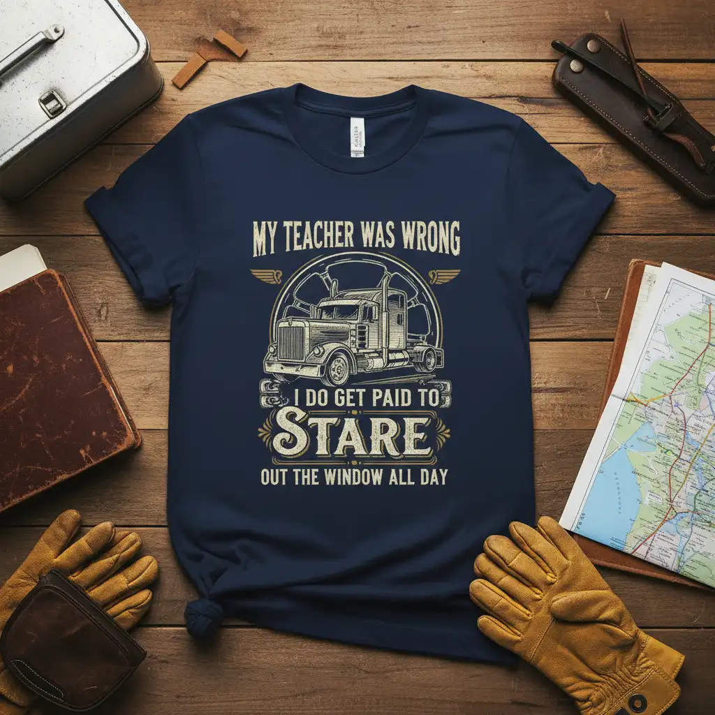 My Teacher Was Wrong I Do Get Paid To Stare Out The Window All Day t-shirt is more than just apparel; it’s a statement piece for anyone who lives life on the open road. This design captures the unique perspective of truck drivers, blending humor with the reality of their daily grind. It’s crafted for comfort and durability, ensuring it becomes a favorite in any trucker’s wardrobe. Whether for yourself or as a thoughtful gift, this tee celebrates the trucking lifestyle with a smile.