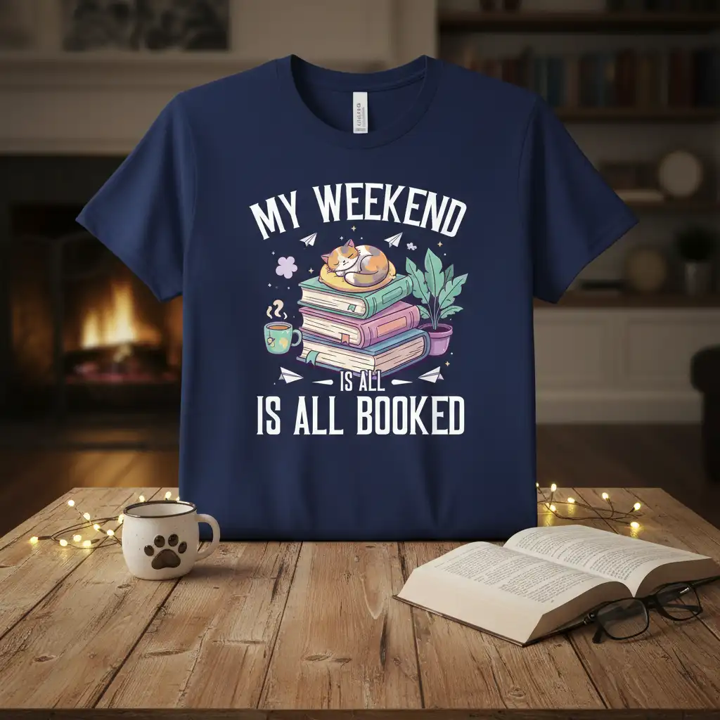 The visual appeal of the design, with its playful cat and inviting book stack, adds a touch of whimsy to any ensemble. It’s a conversation starter for fellow book lovers and a delightful way to express your personal interests without saying a word. This My Weekend Is All Booked design is a testament to the simple joys of reading and the comforting presence of a beloved pet.