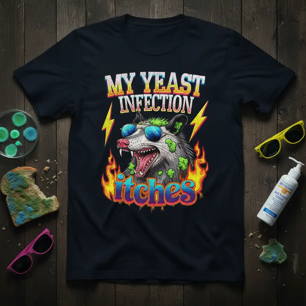 This graphic tee showcases a highly stylized opossum, complete with cool shades and an open mouth, set against a backdrop of vibrant flames. The text “MY YEAST INFECTION itches” is emblazoned above and below the creature in a dynamic, retro-inspired font that adds to the overall edgy aesthetic. The combination of the outrageous slogan and the cool, almost rockstar-like opossum creates a humorous paradox that’s sure to get a reaction.