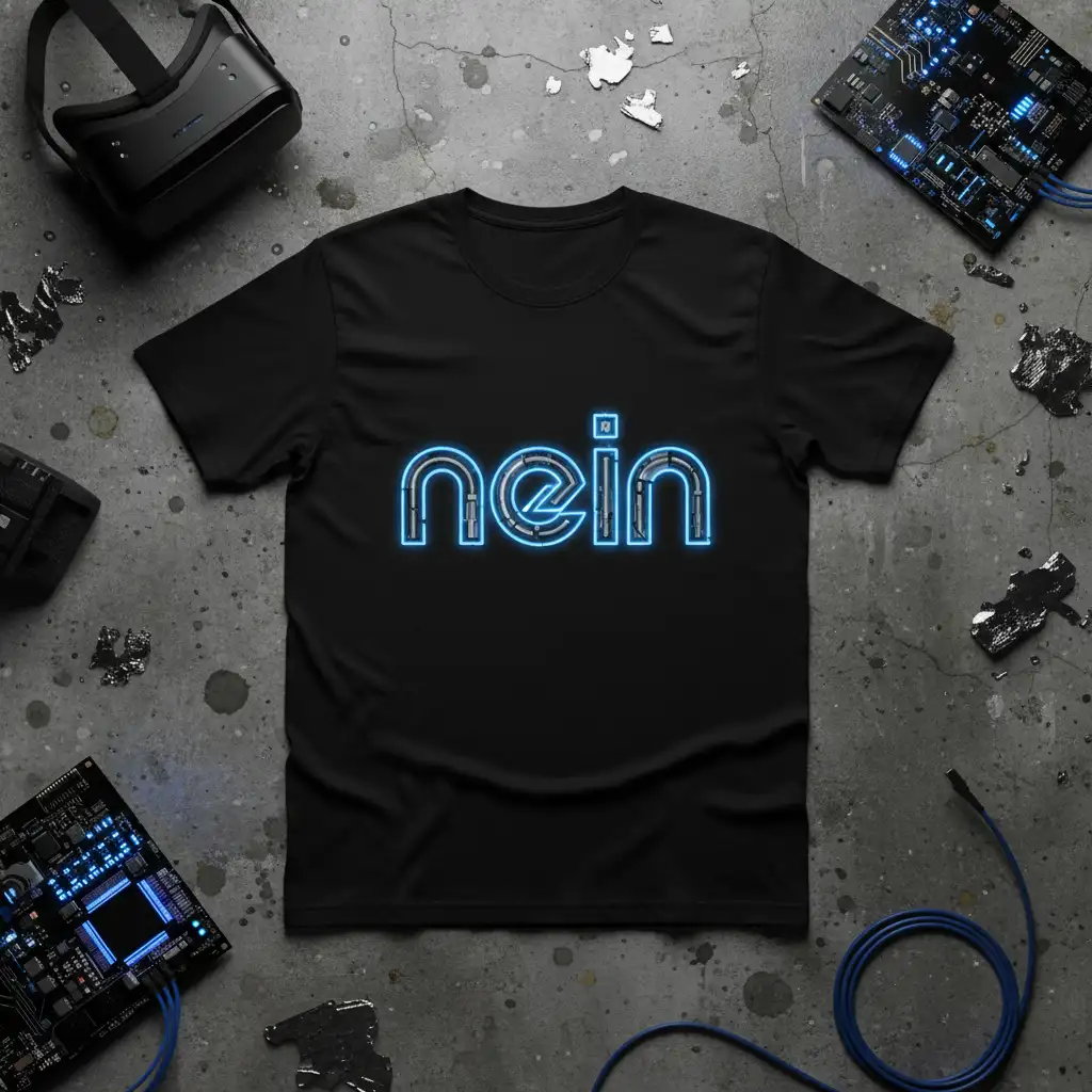 Nein, this isn’t just any t-shirt; it’s a statement piece that communicates a clear message with minimalist flair. Designed for those who appreciate directness and a touch of German wit, this tee features the word “nein” in a captivating blue neon-style font. The striking contrast against the black fabric ensures your message is seen and understood, making it a perfect conversation starter. It’s more than just apparel; it’s a way to express your boundaries and personality with style and confidence.