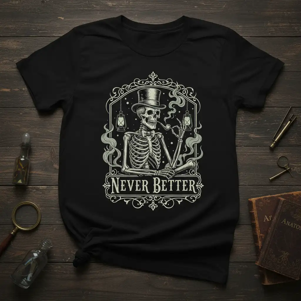 The “Never Better” quote, combined with the vintage skeleton illustration, creates a compelling narrative on this t-shirt. It taps into a sense of ironic detachment and a celebration of the unconventional, making it a favorite among those who march to the beat of their own drum. The artwork itself is a testament to detailed craftsmanship, featuring subtle shading and linework that bring the skeleton to life. This attention to detail elevates the t-shirt beyond a simple graphic print.