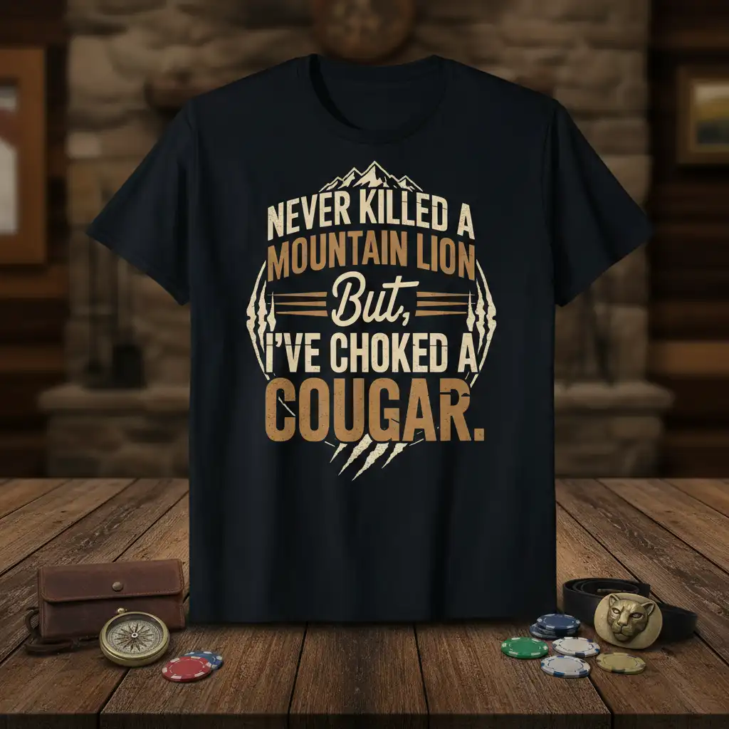 Ready to embrace that wild spirit? Grab the bold graphic tee that says it all: Never Killed A Mountain Lion But I’ve Choked A Cougar.