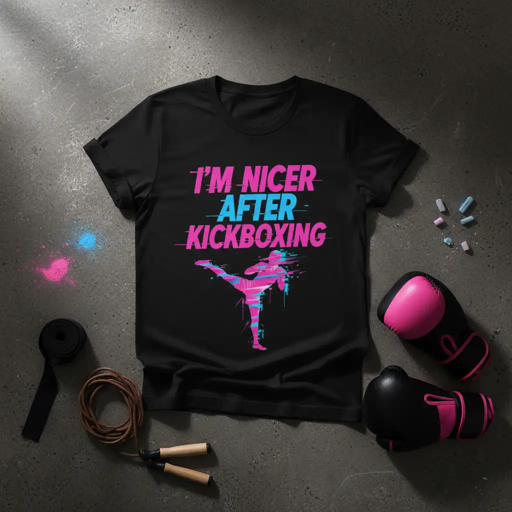Pick from Black, Navy, Royal, Dark Heather, Red, and White to match your mood and wardrobe staples. Each colorway keeps the I’M NICER AFTER KICKBOXING design clear and photo-ready for everyday wear.