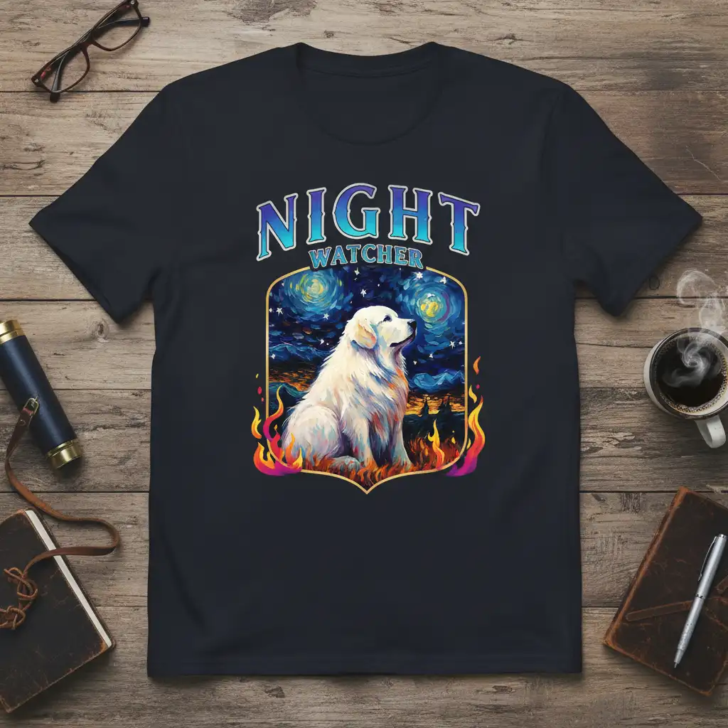 Night Watcher T-Shirt celebrates the unwavering spirit of our canine guardians. This unique design captures the essence of loyalty and protection, featuring a majestic white dog silhouetted against a breathtaking starry night sky. The artwork is rendered in a style reminiscent of Van Gogh, with vibrant colors and swirling celestial patterns that draw the eye. Surrounding the dog are flickering flames, adding a touch of dramatic flair and symbolizing the watchful fire in their eyes. It’s more than just apparel; it’s a tribute to the silent protectors who stand guard through the night.