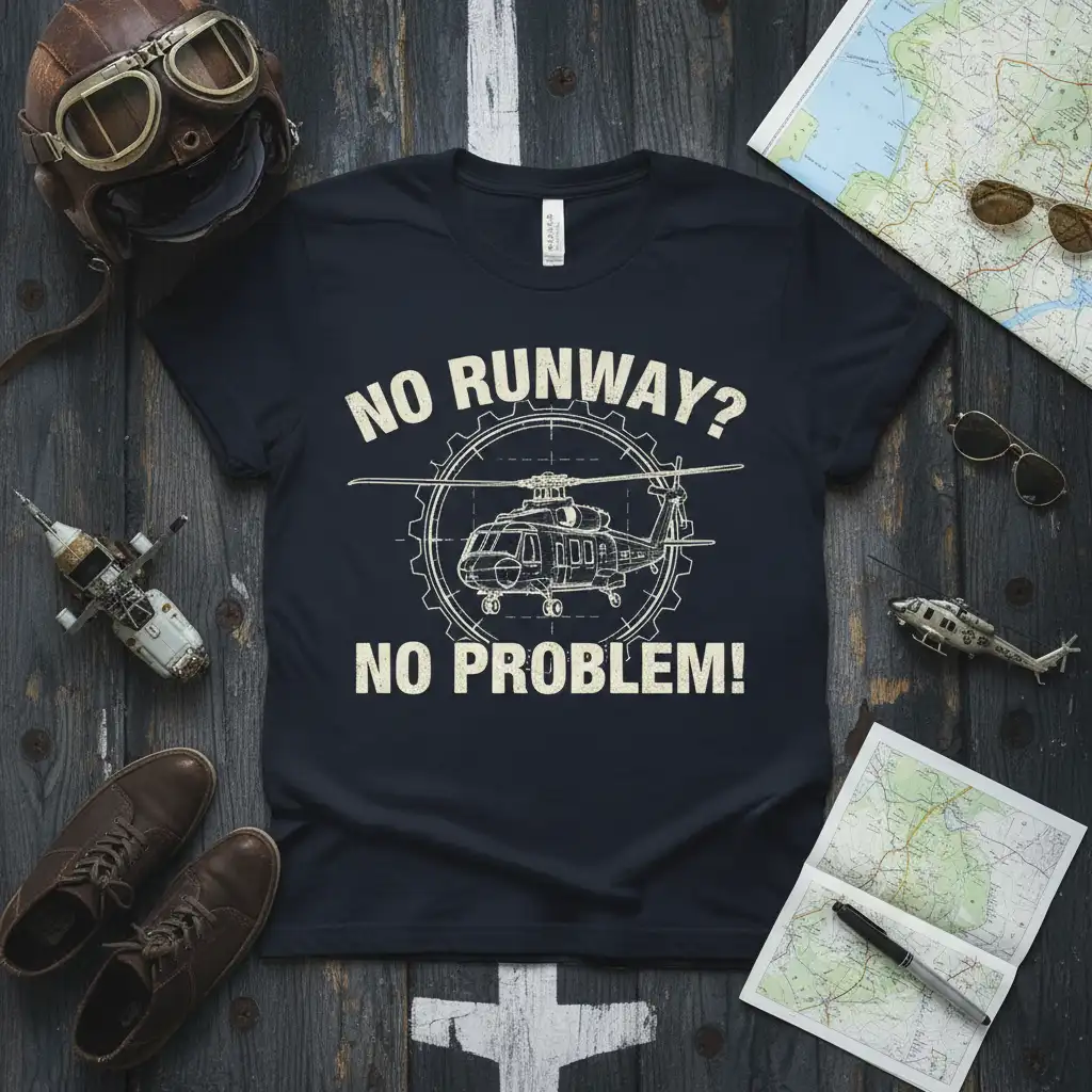 This “No Runway? No Problem!” t-shirt stands out with its unique design and meaningful message. It’s a conversation starter, a symbol of freedom, and a nod to the incredible capabilities of helicopter pilots. The quality of the print and the comfort of the fabric make it a wardrobe essential for any aviation lover.