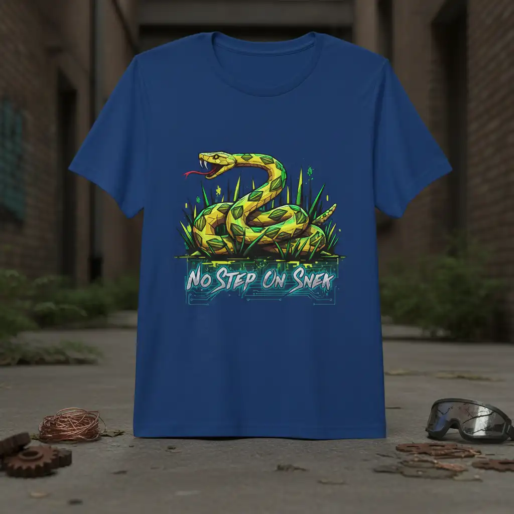 This striking graphic tee brings the popular “No Step On Snek” meme to life with exceptional detail and vibrant colors. The design features a menacing yet stylish snake, coiled and ready, surrounded by an environment that blends natural elements with a tech-inspired aesthetic. It’s a conversation starter that appeals to those who appreciate witty internet humor and distinctive visual art.