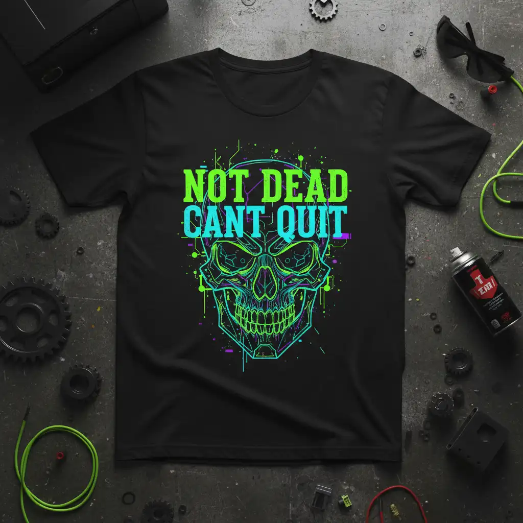 The graphic features a stylized skull, rendered in vibrant neon green and cyan outlines, which perfectly captures the essence of defiance and unyielding spirit. This NOT DEAD CANT QUIT design is not just about looking good; it’s about feeling empowered and motivated every time you wear it, embodying a mindset that refuses to surrender.