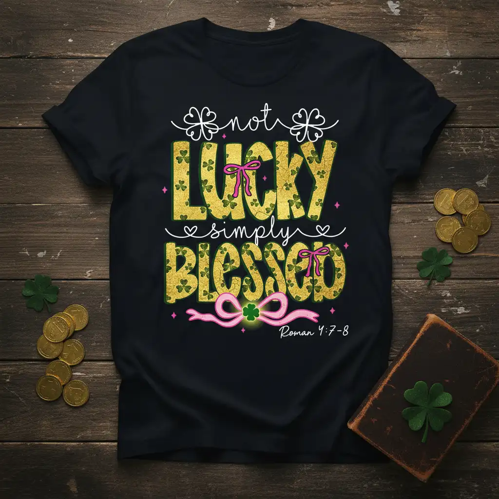 Embrace the spirit of St. Patrick’s Day with a touch of divine grace. This t-shirt features the uplifting message “not LUCKY simply BLESSED,” highlighting a perspective shift from luck to inherent blessings. The design incorporates charming shamrocks and sweet pink bows, creating a festive yet meaningful look. It’s a perfect choice for anyone who wishes to celebrate the holiday while honoring their faith and acknowledging the abundance in their lives.