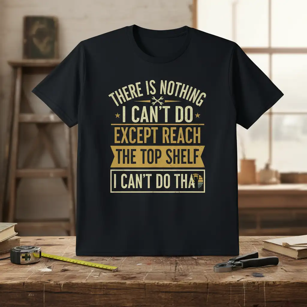 For the builder, the fixer, the tinkerer – this shirt speaks your language. It acknowledges the effort and sometimes the sheer impossibility of certain tasks, like reaching that elusive top shelf. It’s a nod to the challenges we all face, presented with a lighthearted and humorous twist. This tee is perfect for someone who takes pride in their work but doesn’t take themselves too seriously.