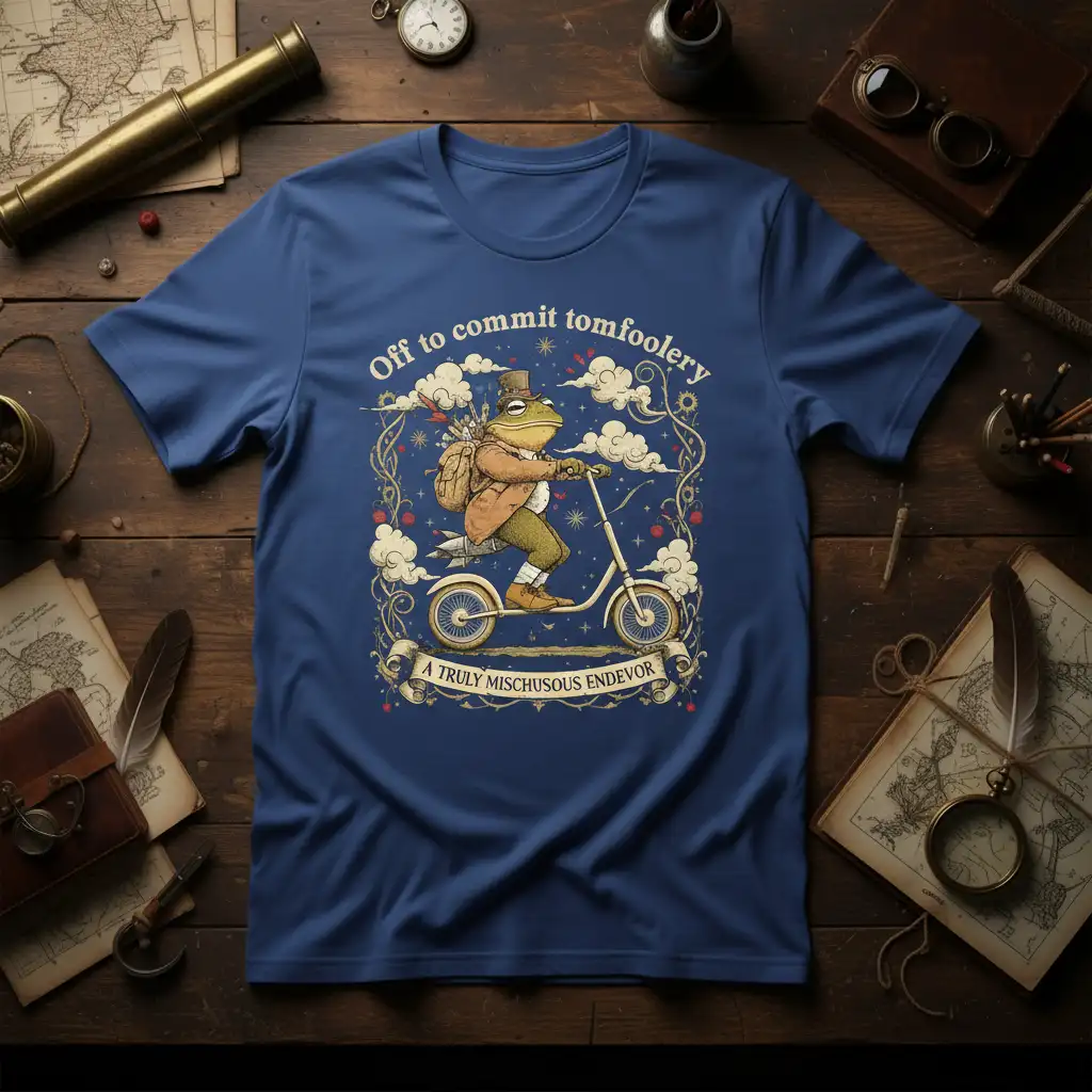 The “Off to commit tomfoolery” t-shirt brings a delightful sense of adventure and playfulness to your wardrobe. The central graphic showcases a charming frog, ready for action on its trusty scooter, surrounded by whimsical clouds and decorative vines. This imagery perfectly encapsulates the spirit of lighthearted mischief and the joy of embracing unexpected escapades. It’s a design that speaks to the free spirit in all of us, encouraging a carefree attitude.