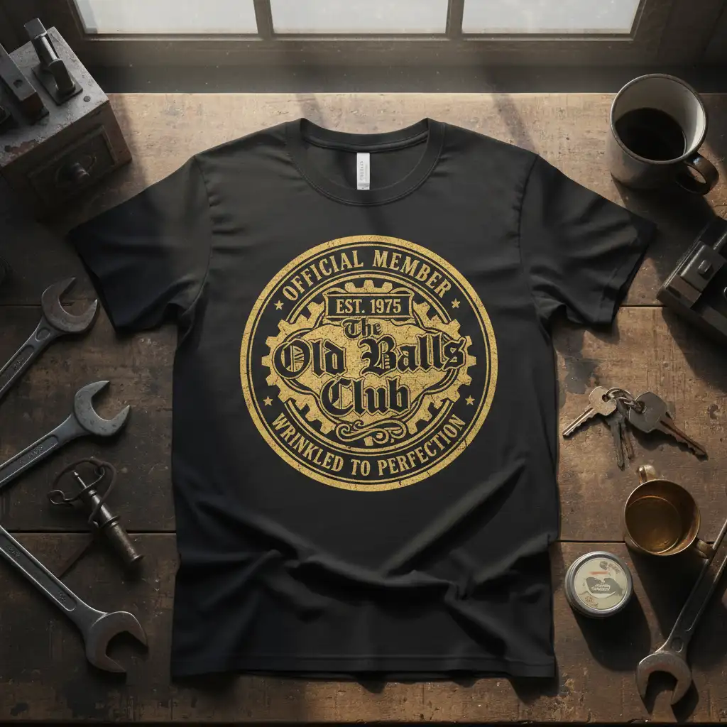 OFFICIAL MEMBER EST. 1975 The Old Ball’s Club WRINKLED TO PERFECTION this t-shirt is more than just apparel; it’s a badge of honor for those who have reached a certain age and embraced it with humor and style. This design speaks to the camaraderie and shared experiences of individuals who understand that aging gracefully also means having a good laugh. It’s perfect for celebrating significant birthdays, anniversaries, or simply as a fun way to acknowledge the passage of time. The distressed vintage aesthetic adds a touch of timeless cool, making it a standout piece for any wardrobe.