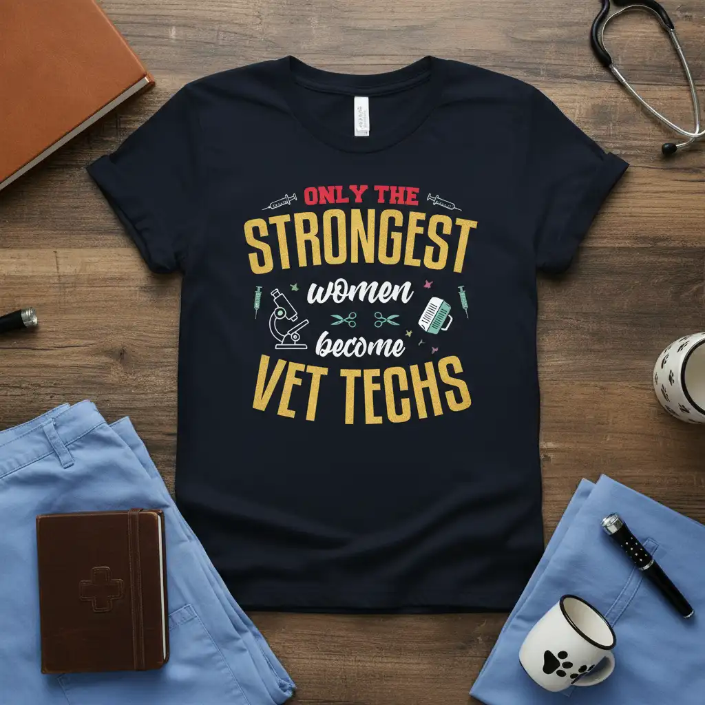 ONLY THE STRONGEST women become VET TECHS, and this t-shirt is a testament to their incredible dedication and hard work. Designed for the resilient women who care for our beloved animals, this tee embodies the spirit of veterinary technicians. It’s more than just apparel; it’s a badge of honor for those who pour their hearts into animal healthcare. Showcasing a powerful message alongside relevant medical iconography, this shirt celebrates the strength and compassion essential in this demanding profession. It’s the perfect way for any vet tech to express their professional pride and passion for their calling.