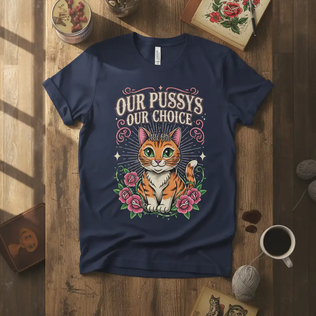 Embrace the spirit of empowerment and feline adoration with the “Our Pussys Our Choice” t-shirt. This shirt is designed for those who believe in standing up for what’s right and expressing themselves with confidence. It’s a testament to the idea that fashion can be a powerful tool for advocacy and personal expression. Don’t miss the chance to own this unique piece that blends bold messaging with delightful artistry. Get yours today and make a statement that matters!