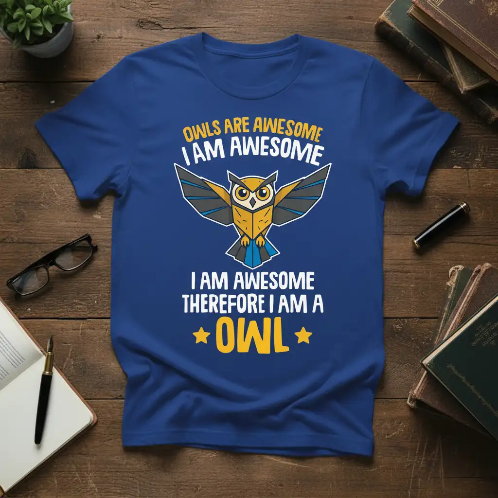 This unique t-shirt proudly displays the full quote “Owls Are Awesome I Am Awesome I Am Awesome Therefore I Am A Owl,” making it instantly recognizable to fans of wordplay and owl appreciation. The design features a stylish illustration of an owl engrossed in a book, perfectly complementing the witty text. It’s designed to be a comfortable and durable addition to any casual outfit, ensuring you look and feel great.