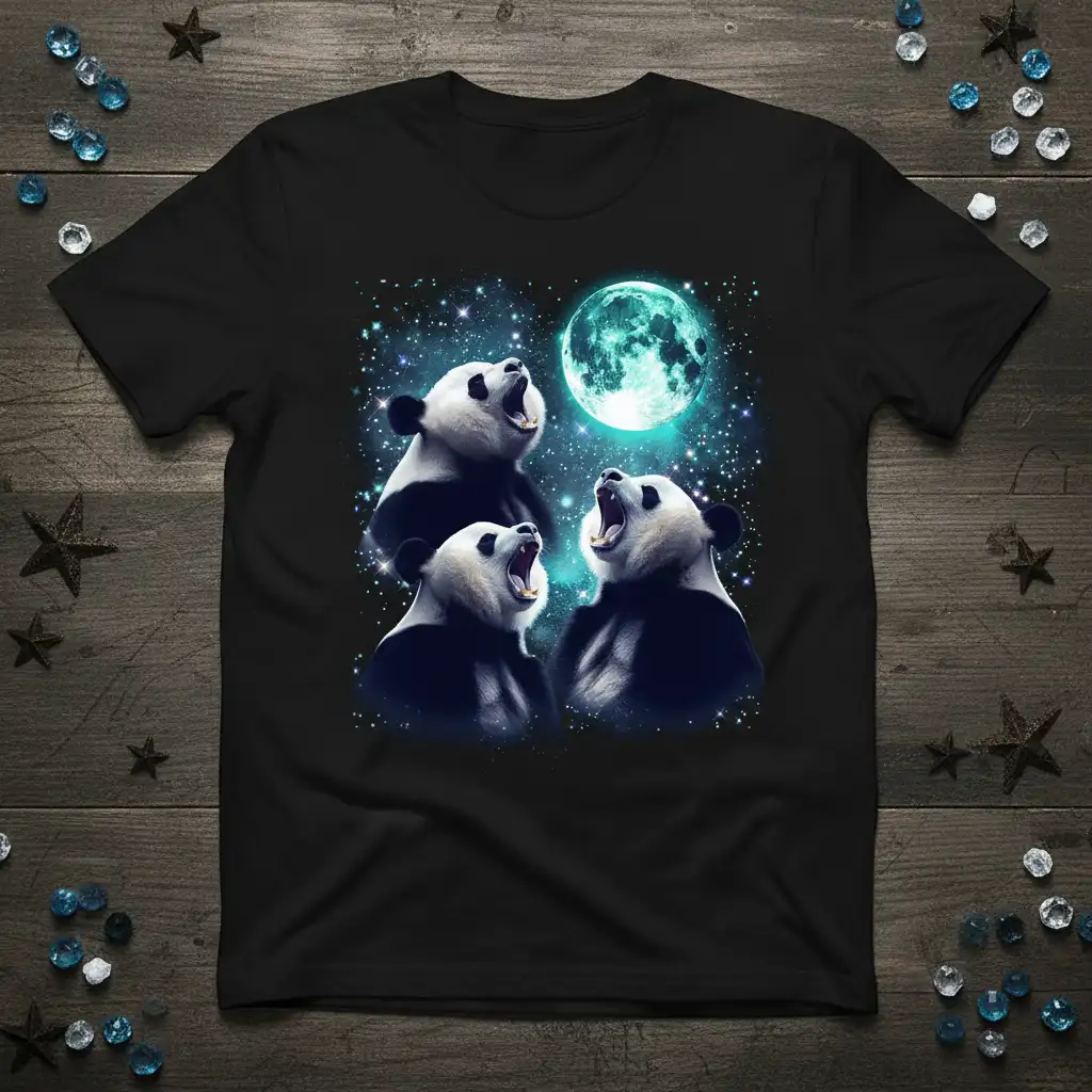 This captivating design showcases three endearing pandas in a moment of shared excitement, howling at a magnificent, glowing moon. The deep space backdrop is adorned with countless stars and subtle nebulae, creating an enchanting and surreal visual experience. It’s a perfect representation for anyone who finds joy in the simple yet profound moments of nature and the mysteries of the universe. The artwork evokes a sense of wonder and delight, making it an ideal choice for those seeking a t-shirt that is both fun and visually striking.