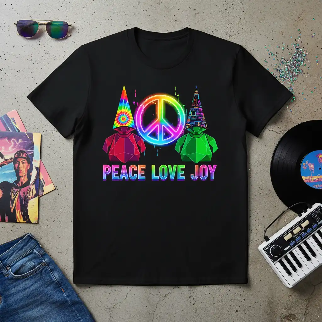 Peace Love Joy emanates from this eye-catching t-shirt, designed for those who appreciate good vibes and unique graphic art. The design features whimsical geometric gnomes alongside a vibrant, neon peace symbol, all set against a classic black background. It’s a perfect fusion of retro aesthetics and positive messaging, making it a standout piece for any casual wardrobe. This tee is more than just clothing; it’s a statement of optimism and a celebration of harmonious living. Embrace the groovy spirit and spread happiness wherever you go with this uniquely designed garment.