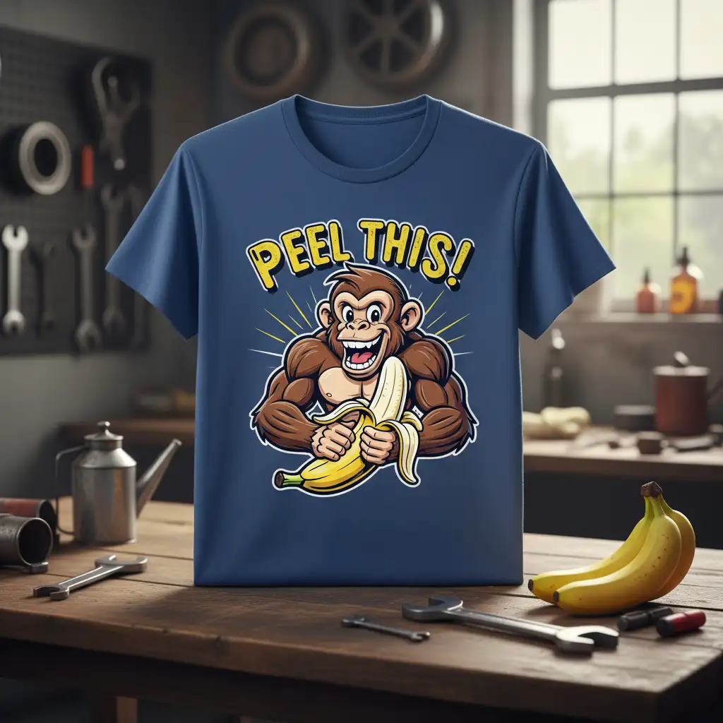 PEEL THIS! This phrase, emblazoned above a comically muscular monkey caught in the act of peeling a banana, perfectly encapsulates the fun and playful spirit of this unique t-shirt. It’s a design that doesn’t just sit on a shirt; it tells a story of humor, a love for puns, and an appreciation for the absurd. The vibrant colors and bold artwork are sure to turn heads and spark conversations wherever you go. This tee is more than just apparel; it’s a wearable piece of art designed to bring joy and a touch of cheeky personality to your wardrobe.