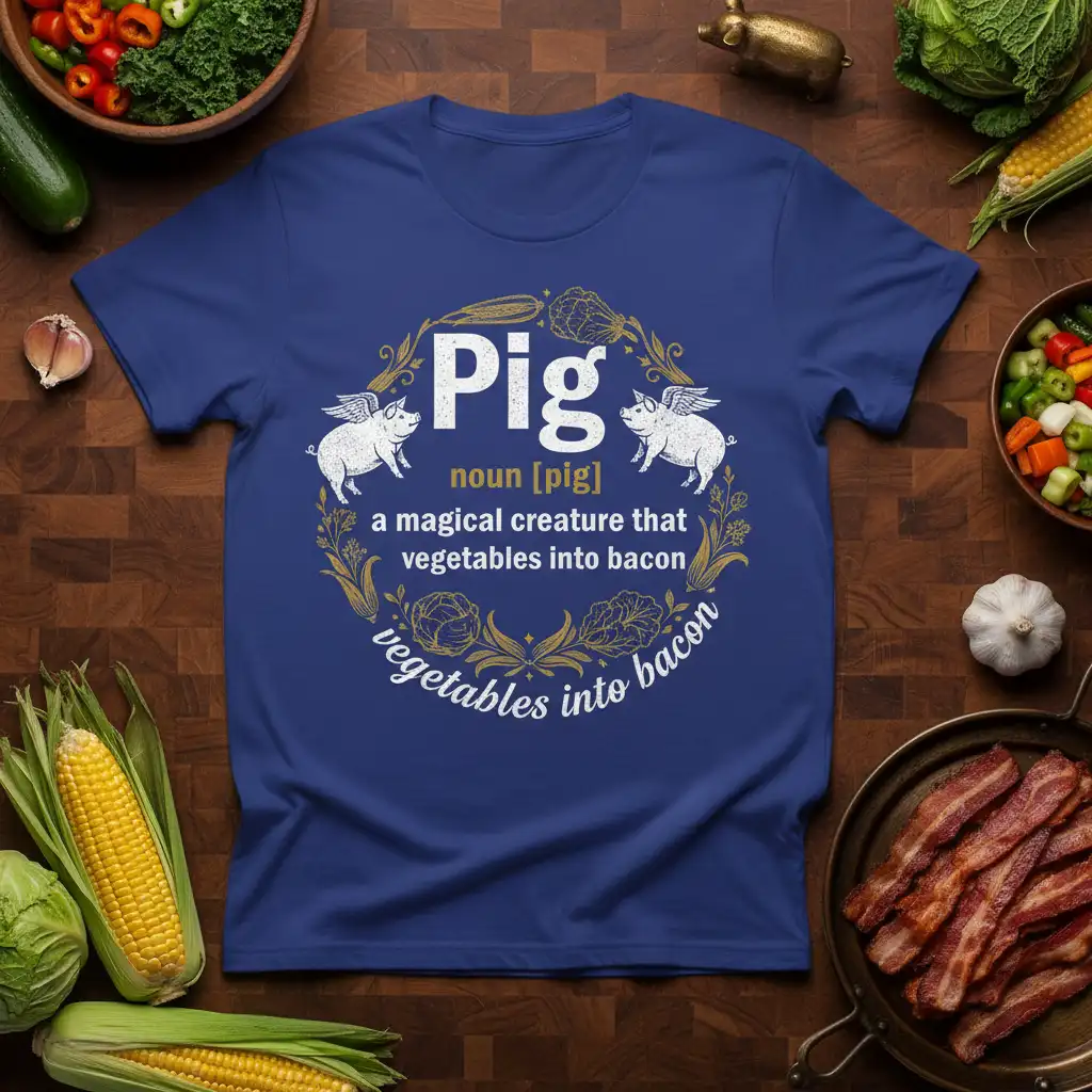 Pig noun [pig] a magical creature that vegetables into bacon vegetables into bacon, this phrase perfectly encapsulates the essence of this humorous and creative t-shirt design. It’s a celebration of culinary delight and the undeniable magic of pork products. Designed for those who appreciate a good laugh and a delicious meal, this tee is sure to become a favorite in any wardrobe. The intricate design features whimsical flying pigs, surrounded by a wreath of vegetables and kernels, further emphasizing the playful definition. This shirt is more than just apparel; it’s a statement piece for food lovers everywhere.