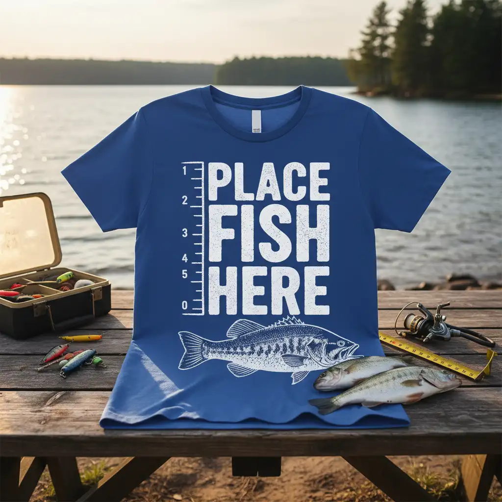 This t-shirt isn’t just about looking good; it’s about embodying the spirit of angling. It’s a symbol of the patience, skill, and pure joy that comes with a successful fishing expedition. This PLACE FISH HERE design is sure to resonate with anyone who has ever felt the thrill of reeling in a big one.