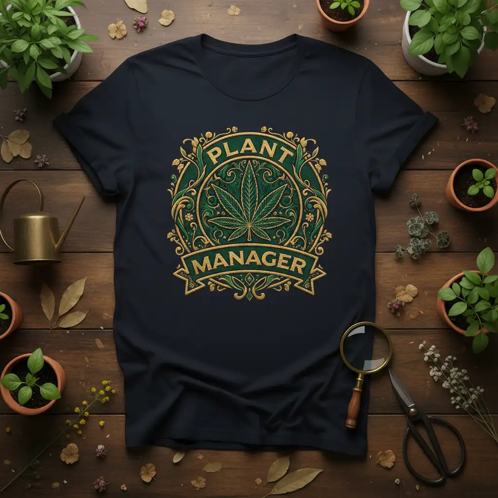 The design features the words “PLANT MANAGER” prominently displayed, signifying authority and expertise in the field of cultivation. The central cannabis leaf is rendered with striking detail, symbolizing growth, nature, and the unique characteristics of this special plant. The surrounding ornate details add a touch of sophistication and artistry to the overall look.