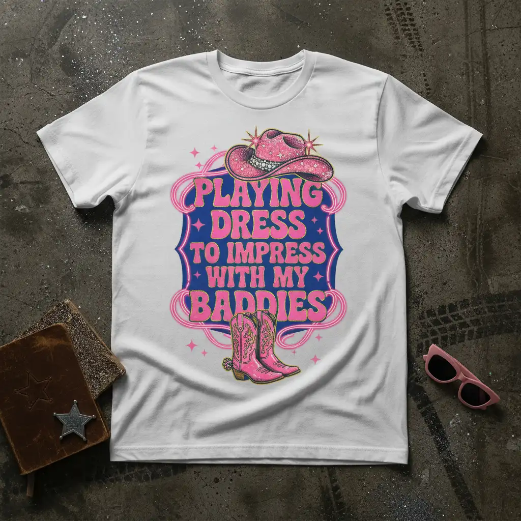PLAYING DRESS TO IMPRESS WITH MY BADDDIES – Playing Dress to Impress With My Baddies is more than just a phrase; it’s an attitude, a celebration of friendship, and a declaration of style. This vibrant t-shirt captures that spirit perfectly, blending playful retro aesthetics with a confident, modern edge. It’s designed for those who love to have fun, look fabulous, and share unforgettable moments with their closest friends. Whether you’re heading to a country concert, a girls’ weekend, or simply want to add some flair to your everyday wardrobe, this tee is your ultimate statement piece.
