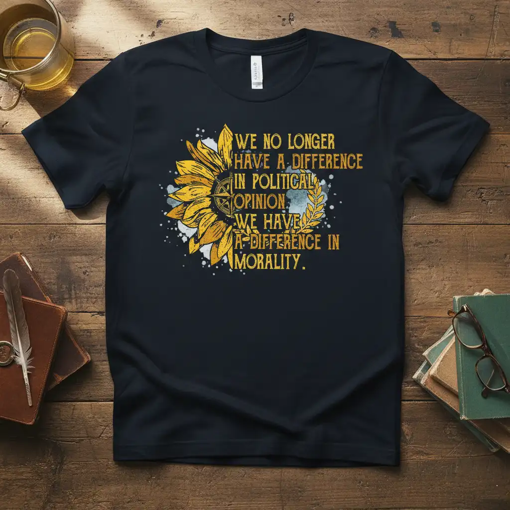 WE NO LONGER HAVE A DIFFERENCE IN POLITICAL OPINION WE HAVE A DIFFERENCE IN MORALITY. This powerful message, emblazoned on a comfortable tee, invites contemplation and conversation about what truly matters. The design combines a striking sunflower, a symbol of optimism and growth, with a clear, impactful statement about the fundamental differences in ethical perspectives. It’s more than just apparel; it’s a wearable philosophy for those who believe that morality transcends political divides and that integrity is paramount.
