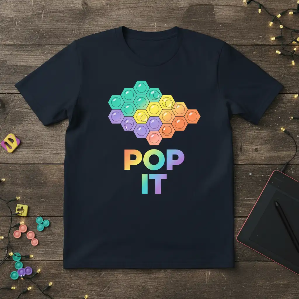 This vibrant t-shirt proudly displays the iconic “POP IT” text, instantly recognizable to fans of the popular fidget toy. The design is complemented by a visually appealing graphic of colorful, hexagonal pop bubbles, mimicking the satisfying texture and appearance of the actual toy. It’s a fun and engaging way to showcase your appreciation for this stress-relieving and entertaining sensation that has taken the world by storm.