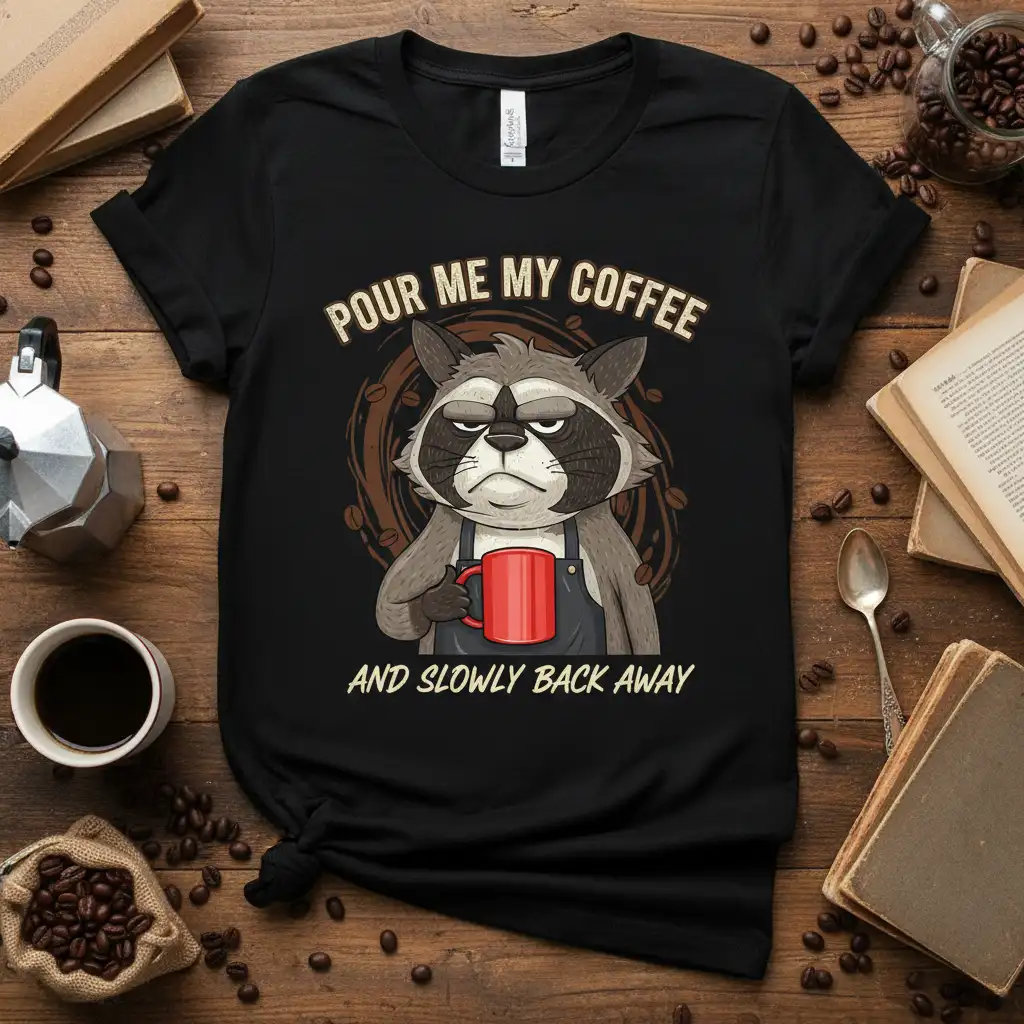 This unique t-shirt design features a meticulously illustrated grumpy raccoon, complete with furrowed brows and a determined grip on a vibrant red coffee mug. The bold typography of “POUR ME MY COFFEE” arches above, while “AND SLOWLY BACK AWAY” sits below, creating a clear, humorous message. Coffee beans and swirling patterns form a rich backdrop, enhancing the overall theme and visual appeal of the graphic. It’s a design crafted to bring a smile to any coffee lover’s face and spark conversations.