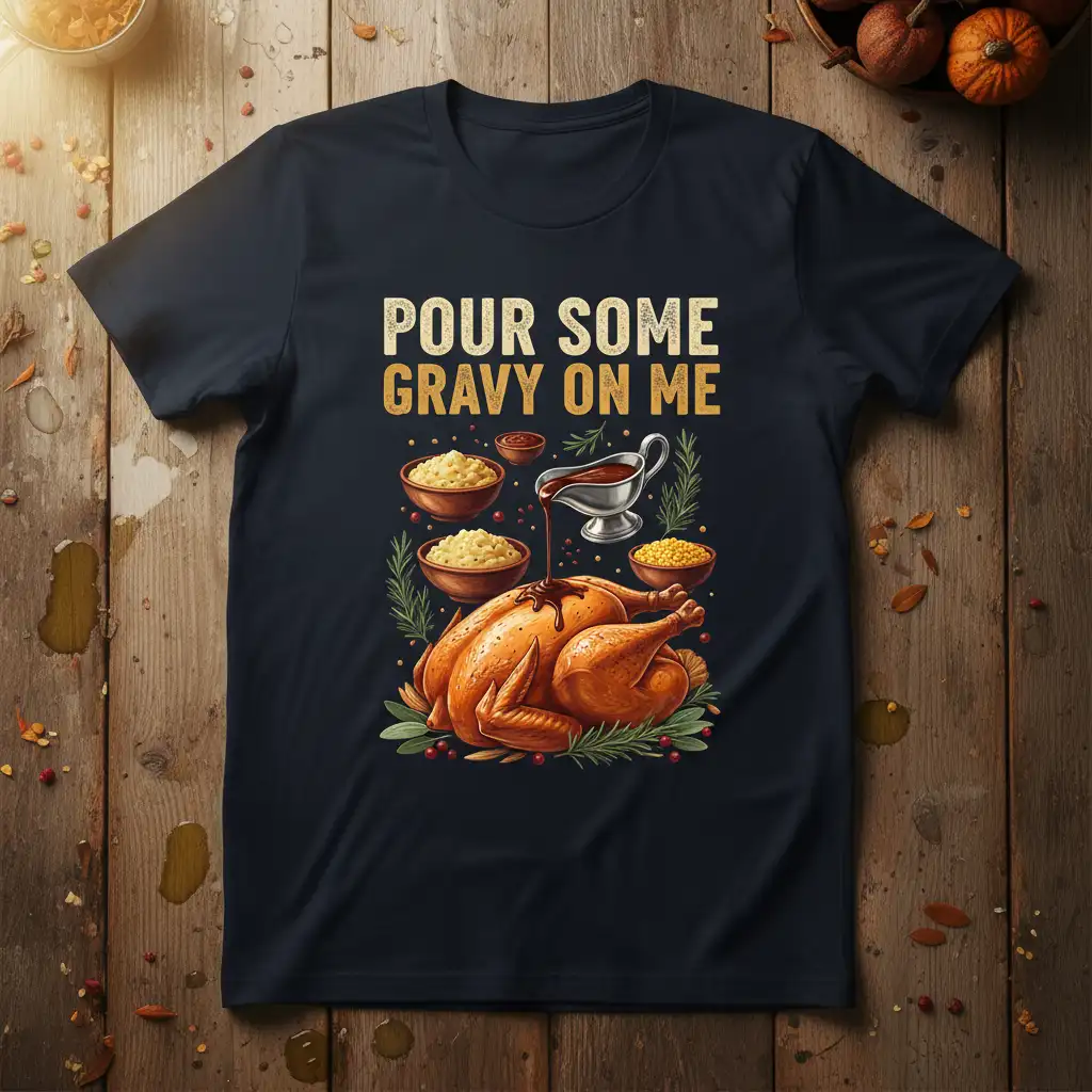 Pour Some Gravy On Me! This delightful t-shirt captures the essence of holiday feasting with a humorous and appetizing design. It’s the perfect way to express your love for Thanksgiving traditions and all the delicious food that comes with them. Whether you’re attending a family gathering or a festive party, this tee is sure to bring smiles and compliments. Its playful message resonates with anyone who believes that more gravy is always the answer, making it an essential addition to your holiday wardrobe.