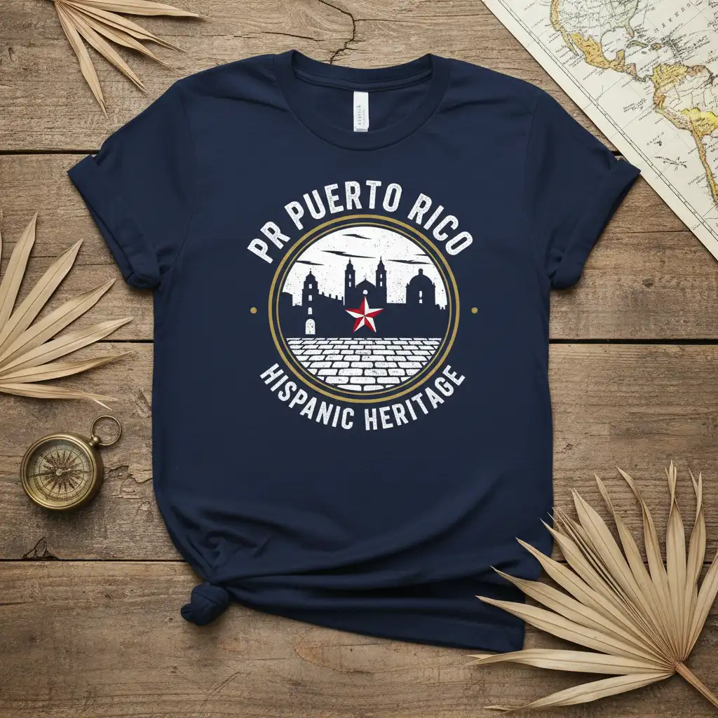 This design is a tribute to the enduring spirit and rich cultural tapestry of Puerto Rico. It features a classic circular emblem that encapsulates the island’s architectural beauty and symbolic representation. The phrase “PR Puerto Rico Hispanic Heritage” is prominently displayed, serving as a bold statement of cultural connection and pride. It’s a perfect way to express your identity and share your love for the island with the world.